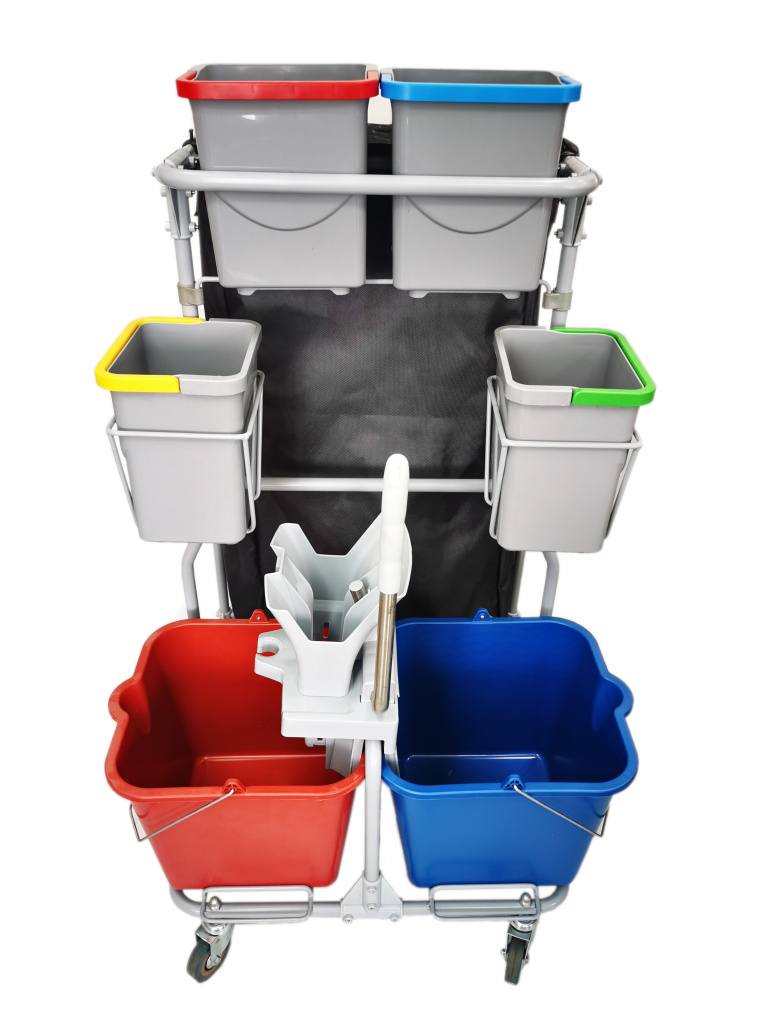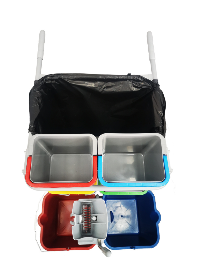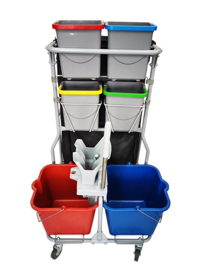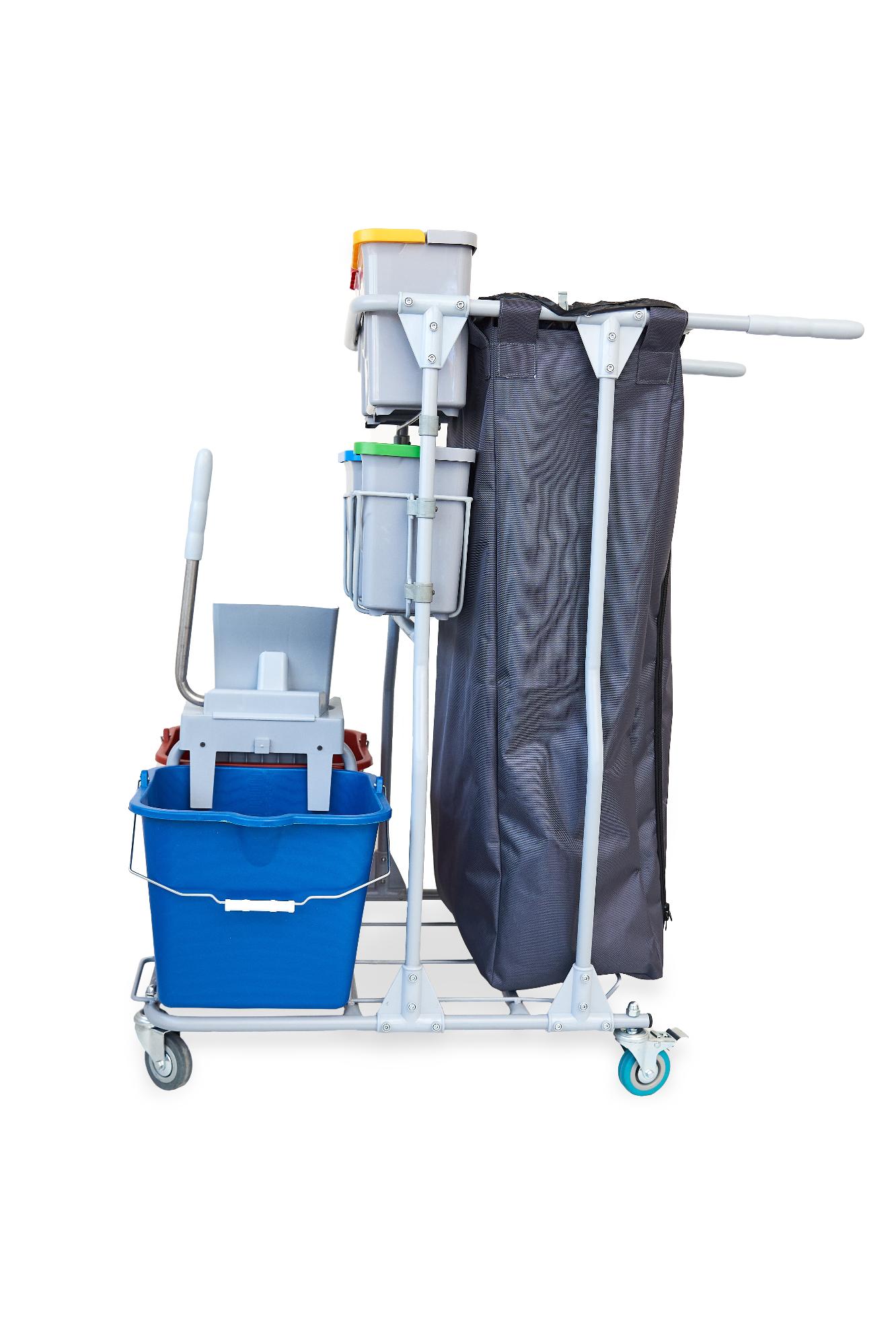 Элементы тележки собираются при помощи болтового соединения и пластиковых элементов. Сборно - разборная конструкция позволяет снизить издержки связанные с транспортировкой и складским хранением. В разобранном виде тележка занимает всего 45% от собранного состояния.Тележка комплектуется двумя ведрами по 20л, и четырьмя ведрами объемом 4л для влажных салфеток или различных расходных материалов, инвентаря, химии. Верхний ряд малых ведер вынимается вертикально вверх, нижний ряд малых ведер устанавливается в металлические корзины, которые крепятся на двойные пластиковые петли, которые обеспечивают компактное размещение при этом сохраняют удобство использования малых ведер.
