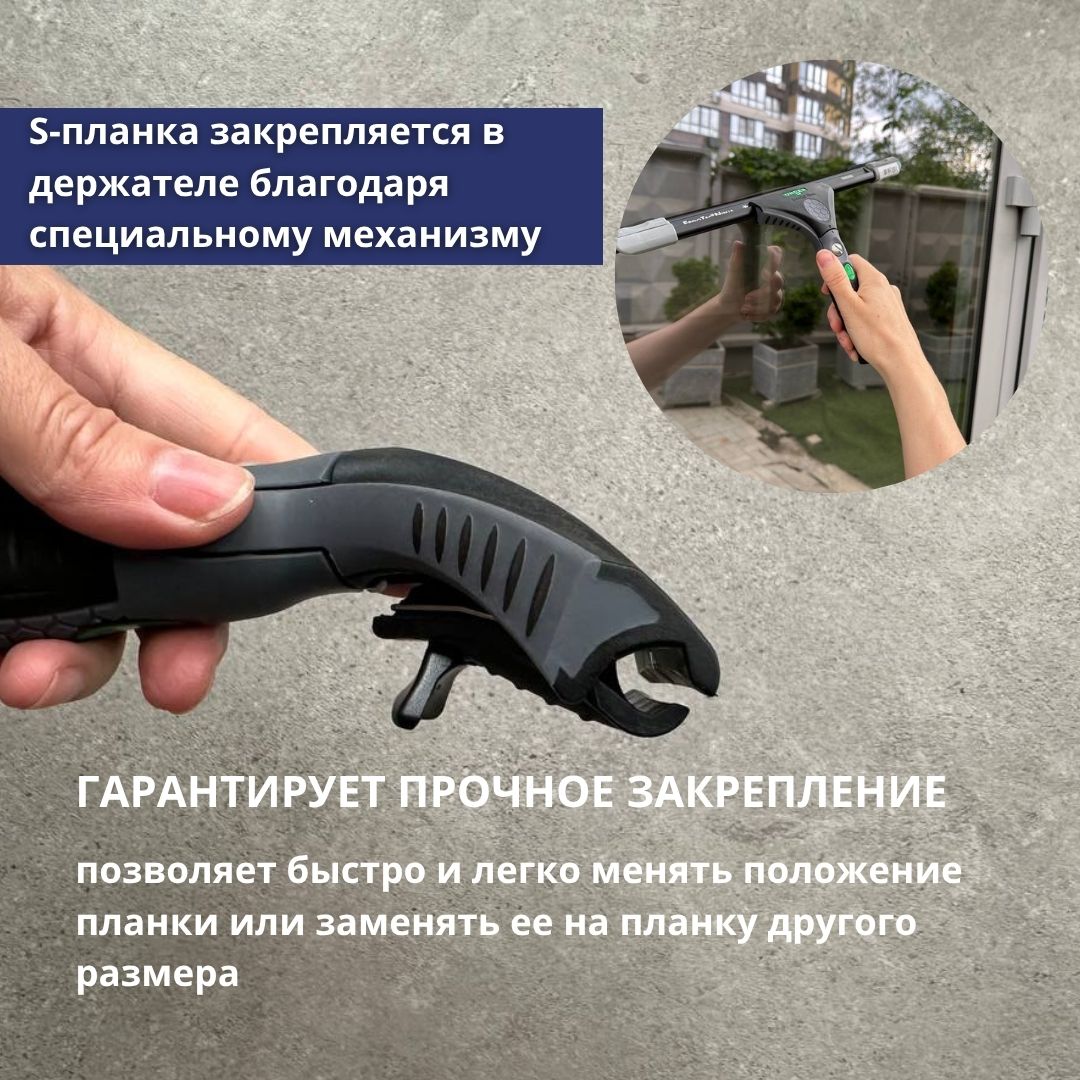 Рабочий узел поворачивается на 180°. Это облегчает работу в труднодоступных местах и на высоте с помощью телескопических штанг. Усилие, которое требуется для поворота, можно легко отрегулировать специальным винтом с помощью обычной монетки. Специальная зеленая кнопка позволяет зафиксировать держатель в центральном положении. S-планка закрепляется в держателе благодаря специальному механизму, который, с одной стороны, гарантирует прочное закрепление, а с другой - позволяет быстро и легко менять положение планки или заменять ее на планку другого размера.В ассортименте представлены специальные S-планки Ninja от 20 до 105 см. Использование планок большой длины значительно снижает время мытья больших окон и повышает производительность труда.